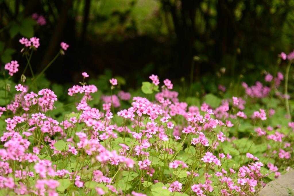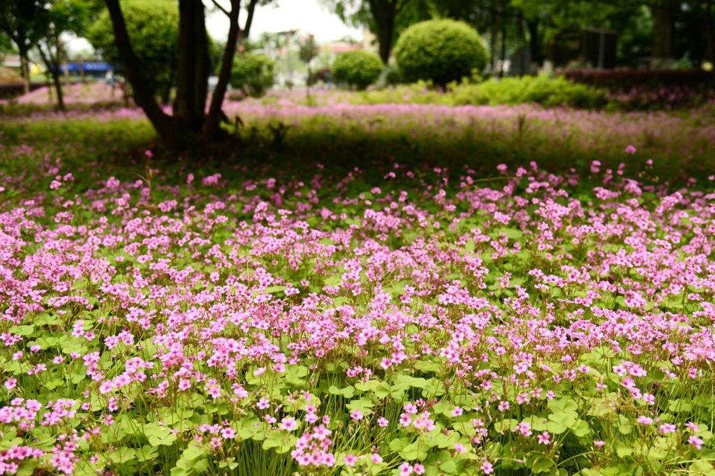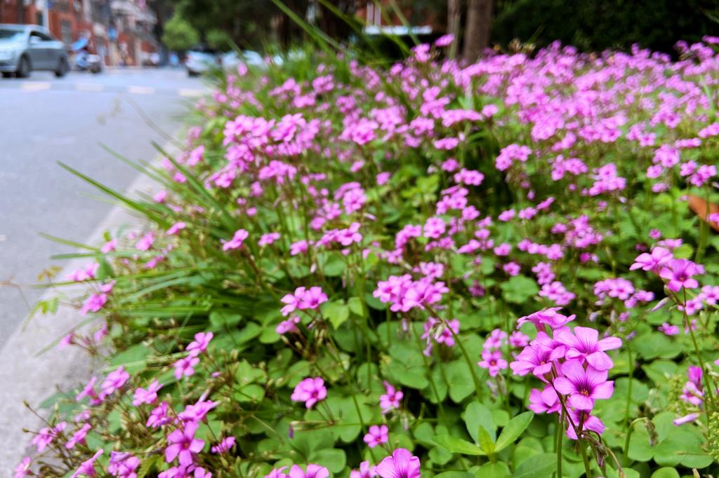 小满时节,红花酢(cù)浆草在校园各处角落竞相开放,紫粉色的花朵吸引无数蜜蜂在花丛间流连。红花酢浆草的五叶花瓣,中间藏着小小的黄色花蕊,随手摘一朵闻闻,一股清新酸涩的青草味便蔓延开来。三五成群的青年学生在花间细语、嬉闹,一片生机盎然。