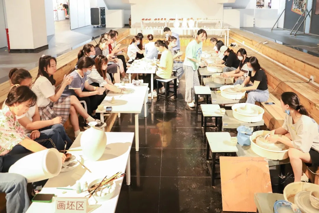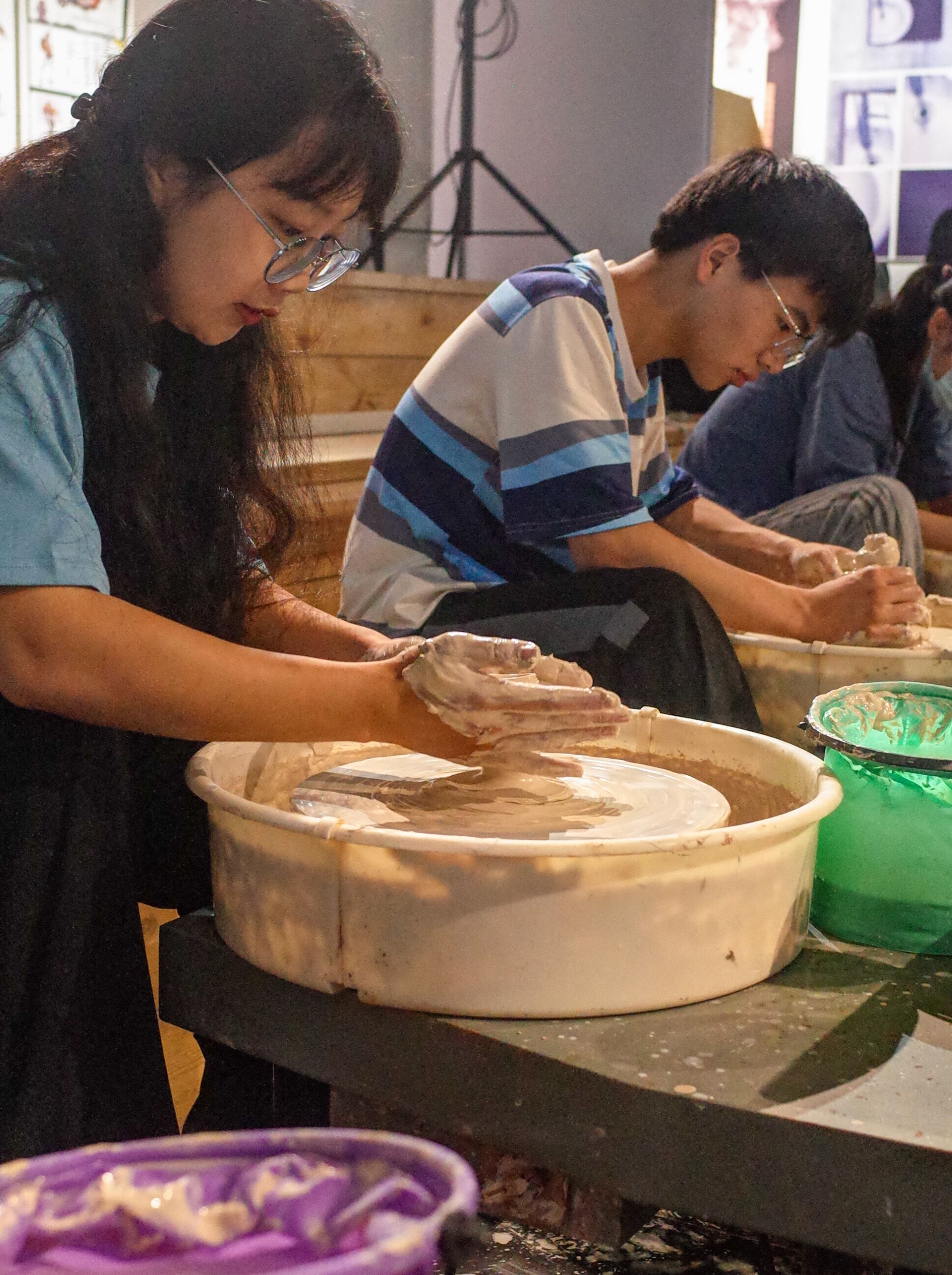美育团队成员一大早便来布置现场。“第一次做其他专业同学的‘陶艺导师’,觉得有点紧张。但是想到能够通过自己的努力带动更多人了解陶艺、学习陶艺又觉得很兴奋。传统手工艺作为一种特别的文化载体,承载着人类对艺术的寄托,应该被更多年轻人学习与坚守。”他们的耐心指导,也得到了在场同学的一致好评。