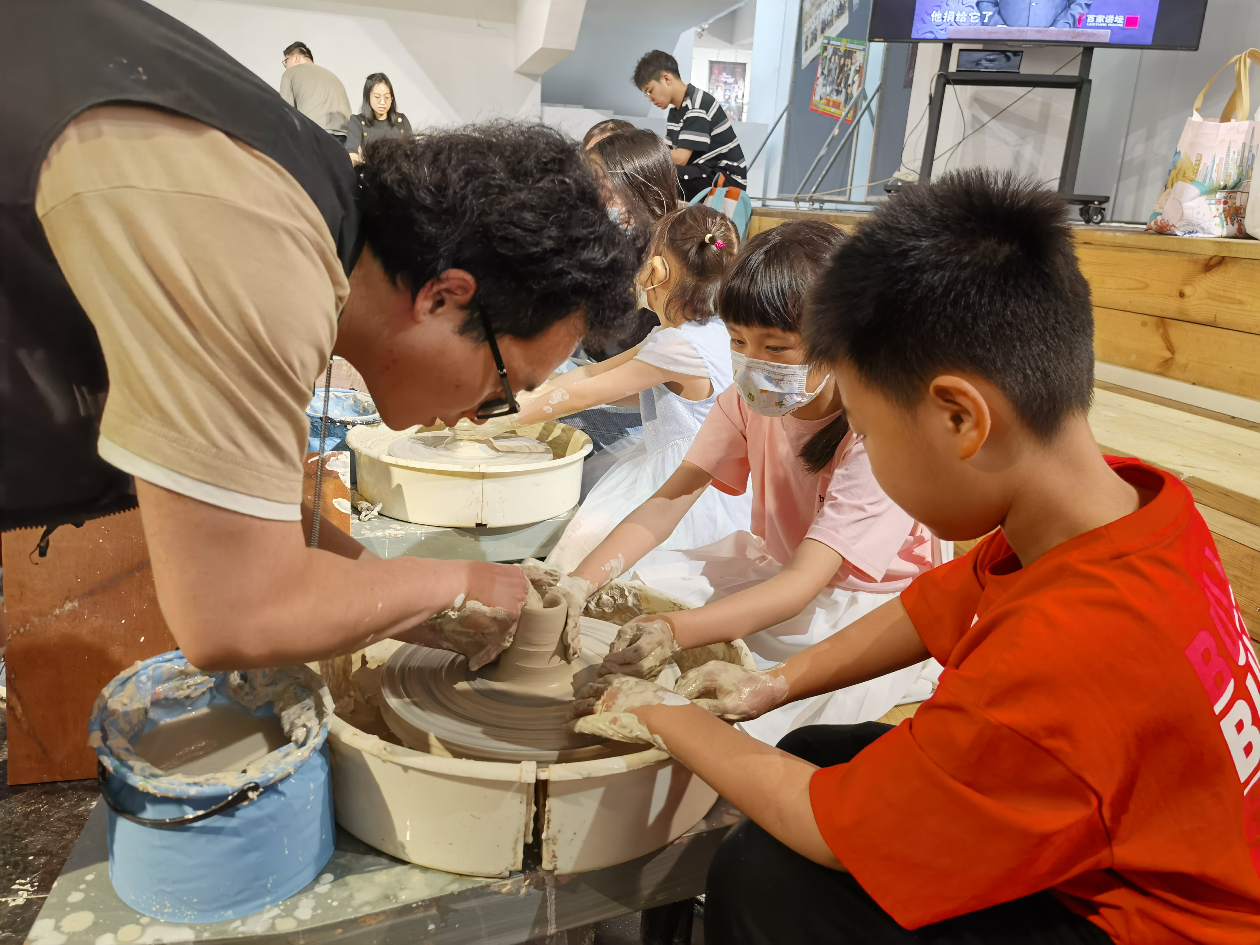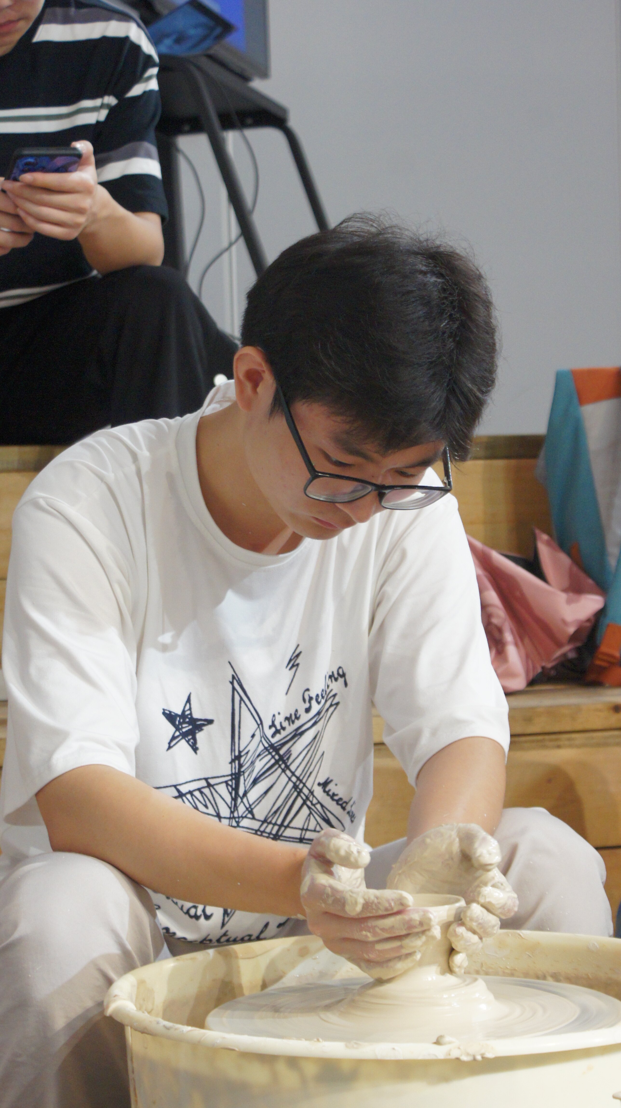 活动伊始,“陶艺导师”带领大家欣赏了陶瓷艺术品。触摸冰凉的陶器,感受传承千年手工艺的温度。随后,“陶艺导师们”按陶艺制作流程依次示范:拉胚、画胚、盘泥条……双手灵动之间,形态跃然而出,朴素的泥巴蜕变成艺术品。接着,艺术设计学院王欣老师与宋志来老师带领的学生美育团队手把手教学,指导同学们制作陶艺。